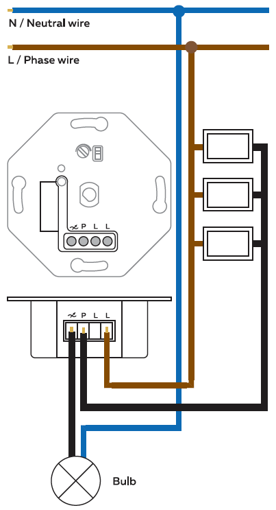 - L (brown): Connect the phase wire to the L connection of the dimmer and run an extra wire to the switches..