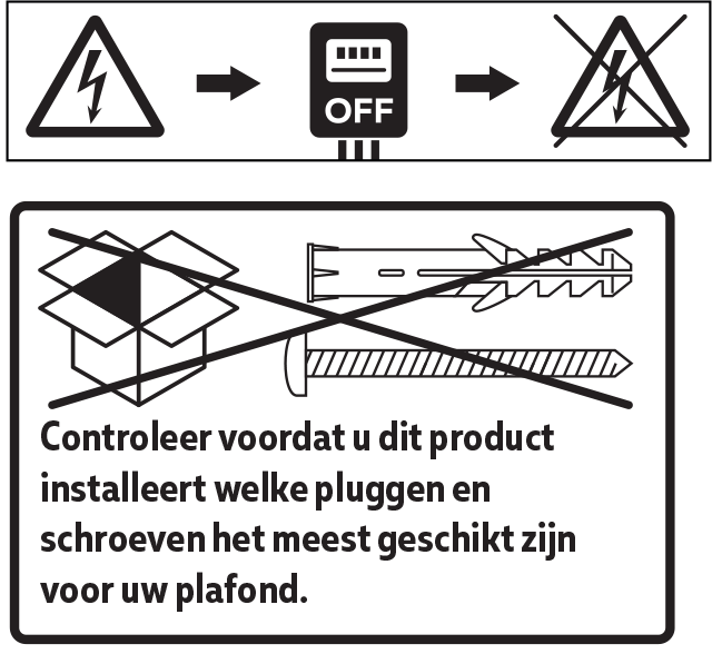 - Om mogelijke elektrische schokken te voorkomen, moet u, voordat je uw ventilator installeert, de stroom naar de stopcontactdoos en de bijbehorende wandschakelaar loskoppelen.
