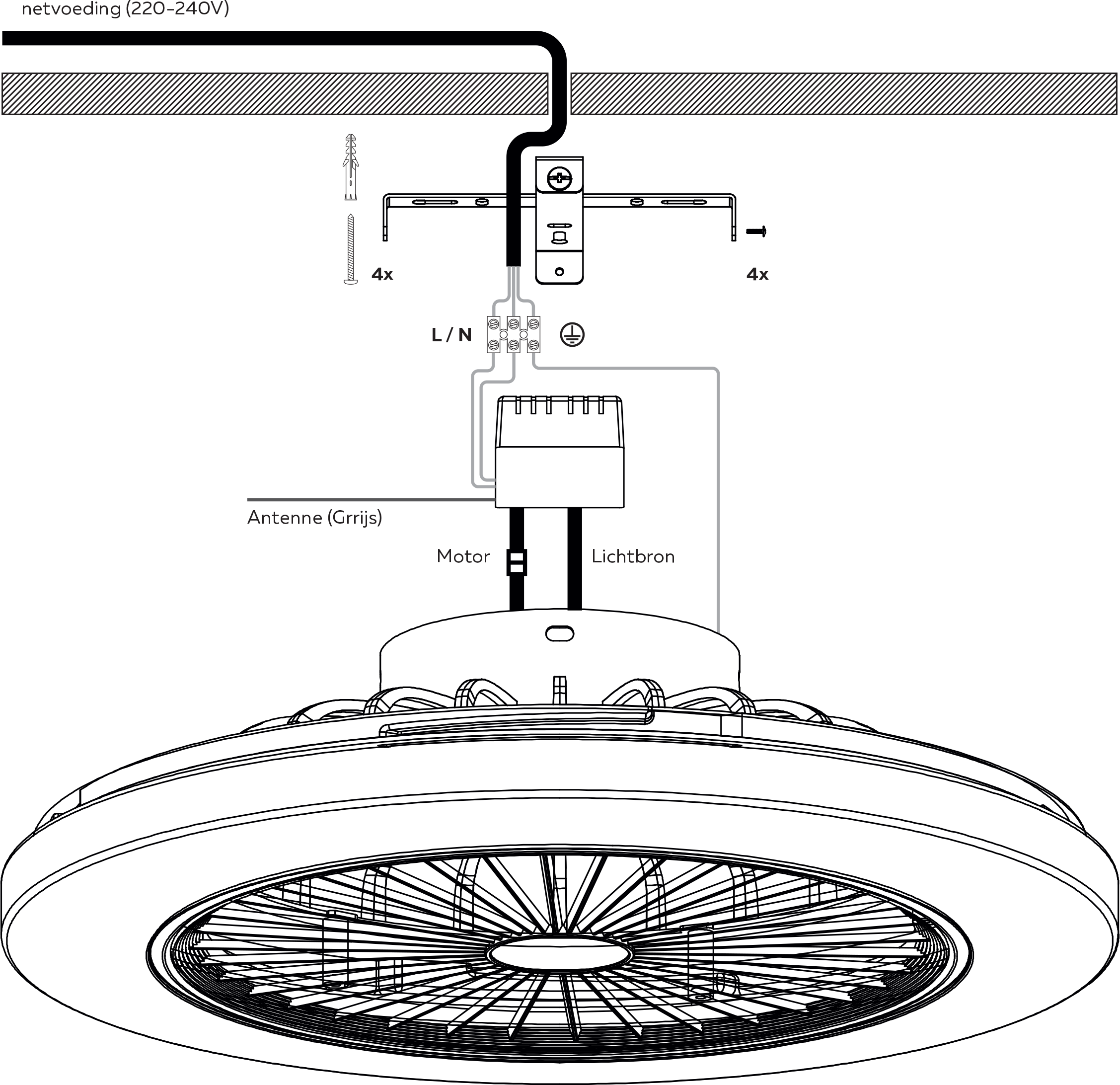 - Gebruik alleen bevestigde onderdelen om het risico op persoonlijk letsel te verminderen. Bevestig de ventilator rechtstreeks aan het plafond van het gebouw volgens deze instructies.