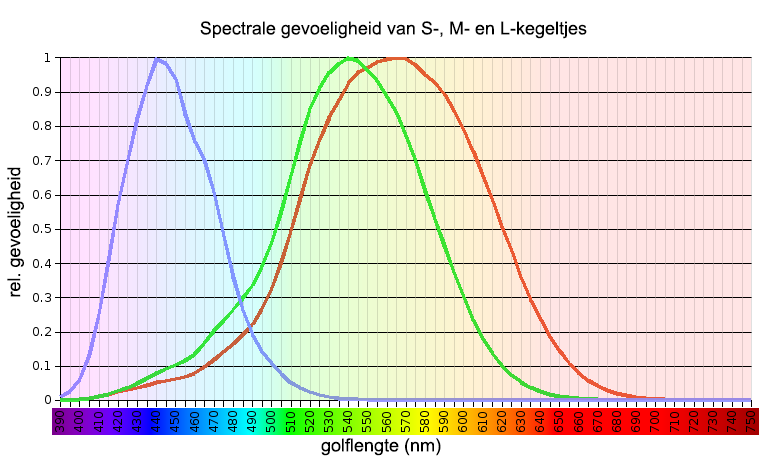 Netvliesgevoeligheid betekent: de gemiddelde gevoeligheid van het menselijk oog voor verschillende kleuren (golflengten). Dit wordt bepaald door drie soorten lichtgevoelige cellen die receptoren of kegeltjes worden genoemd. Deze kegeltjes zijn vooral goed vertegenwoordigd in het gele deel van het spectrum.